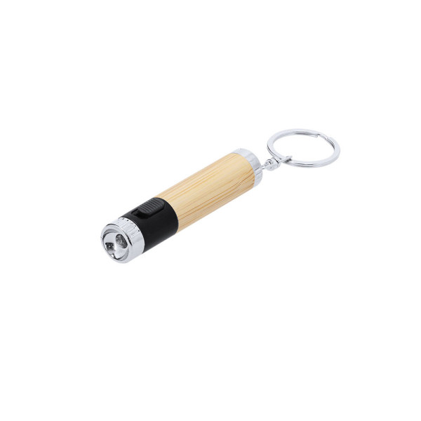 Keychain flashlight made of bamboo and ABS. With 1 LED powered by button batteries (included) with on/off switch on the side and chrome decorative elements.Materials like bamboo promote the use of natural raw materials, reducing harmful emissions. It comes from a highly resilient and versatile plant, with rapid growth and regeneration, making it an excellent alternative to traditional wood.