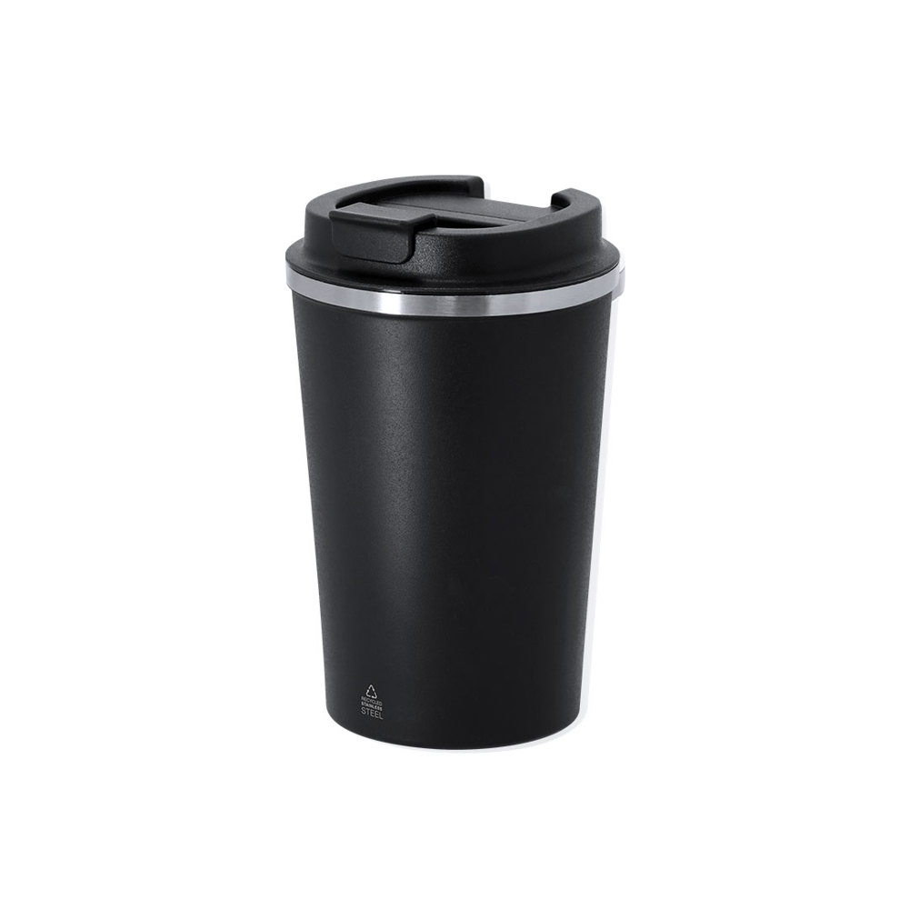 350 ml capacity thermal mug made from Recycled Stainless Steel with double wall. With double wall for better and longer-lasting temperature preservation and ceramic-coated interior, suitable for carbonated beverages. Equipped with a black dosing lid designed to prevent leaks and BPA-free. Featuring a Recycled Stainless Steel emblem.Stainless steel is one of the most demanded materials and can be found almost everywhere, from everyday products to large constructions. With countless properties, including durability and a high degree of reuse, making it a highly valued alternative in sustainability solutions. When properly treated, it allows for the extraction of new resources for infinite use.
