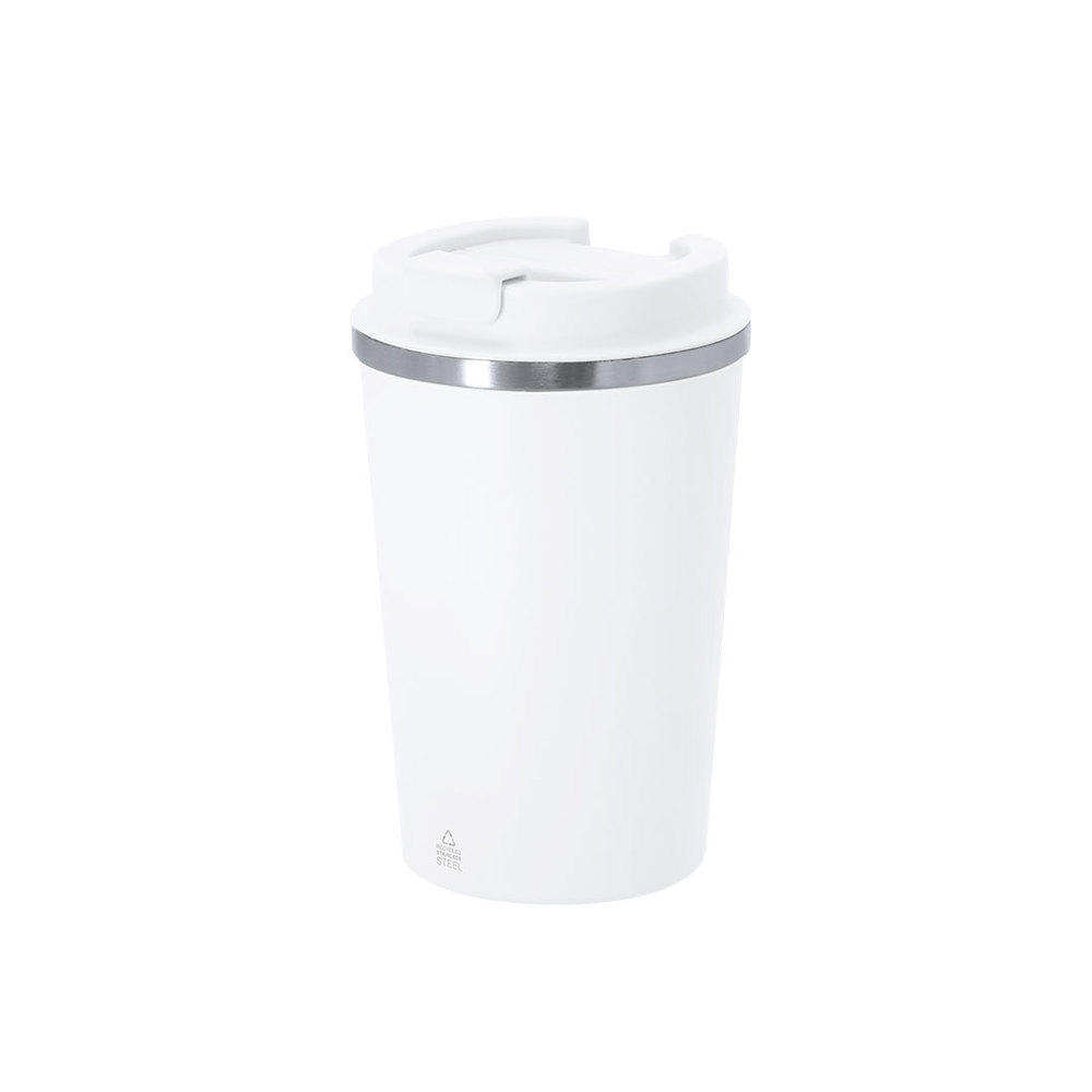 350 ml capacity thermal mug made from Recycled Stainless Steel with double wall. With double wall for better and longer-lasting temperature preservation and ceramic-coated interior, suitable for carbonated beverages. Equipped with a black dosing lid designed to prevent leaks and BPA-free. Featuring a Recycled Stainless Steel emblem.Stainless steel is one of the most demanded materials and can be found almost everywhere, from everyday products to large constructions. With countless properties, including durability and a high degree of reuse, making it a highly valued alternative in sustainability solutions. When properly treated, it allows for the extraction of new resources for infinite use.