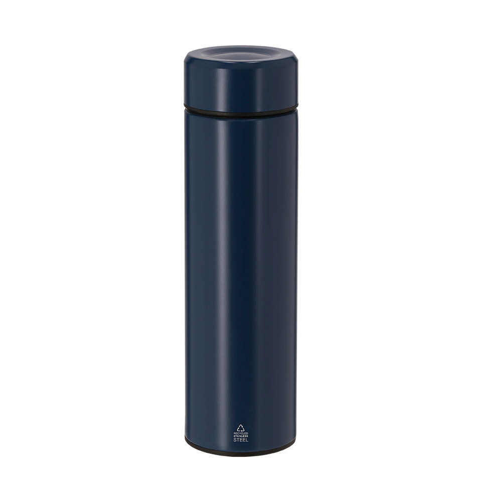 450 ml capacity thermos made from Recycled Stainless Steel. With double wall for better and longer-lasting temperature preservation and ceramic-coated interior, suitable for carbonated beverages. Infuser included and easy-to-open screw system. Featuring a Recycled Stainless Steel emblem.Stainless steel is one of the most demanded materials and can be found almost everywhere, from everyday products to large constructions. With countless properties, including durability and a high degree of reuse, making it a highly valued alternative in sustainability solutions. When properly treated, it allows for the extraction of new resources for infinite use.