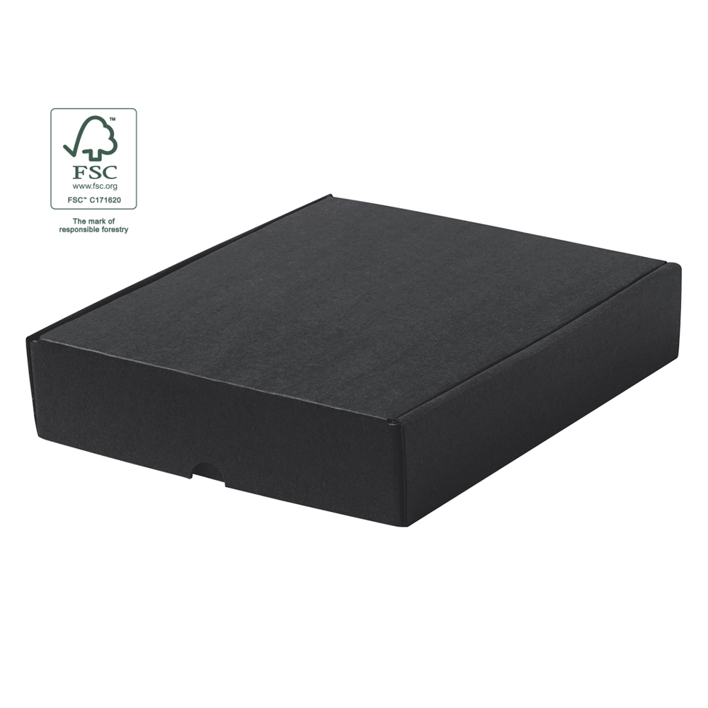 Medium-sized presentation box made of black corrugated cardboard. In line with the market trend towards comprehensive gift sustainability, offering solutions to help improve and preserve our planet.
