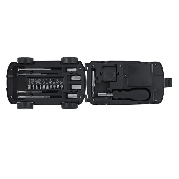 Tool set with a case shaped like a car and an LED flashlight. With 20 tools. Includes:- Precision screwdriver set (flat and Philips)- Fixing tool- Multifunction handle with flat and star screwdriver heads- Wrenches for hex nuts- Tape measureWith a flashlight with 2 integrated LEDs in the case, powered by 4 AAA batteries (not included).