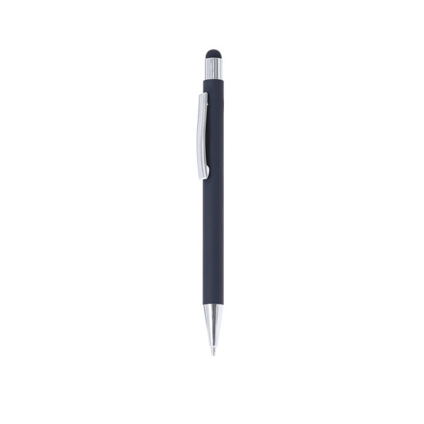 Pointer push mechanism pen made of recycled aluminum. Chrome finished push button and metal clip, finished with matching pointer. Rubber finish body, specially designed for laser marking. Recycled aluminum label on the top of the pen. Jumbo cartridge and blue ink.Recycled aluminum is a material with nearly infinite recycling possibilities, without losing its original properties and consuming less energy in this process.GRS certification (Global Recycled Standard) guarantees the recycled origin of the material used to manufacture the product.