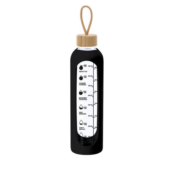 1L glass bottle designed to encourage proper hydration. Covered with a silicone sleeve that protects and provides a comfortable and secure grip. Includes capacity indicator in liters and ounces, accompanied by motivational phrases that inspire maintaining proper daily hydration. The cap, made from bamboo, includes a convenient cord for easy transport. BPA-free.