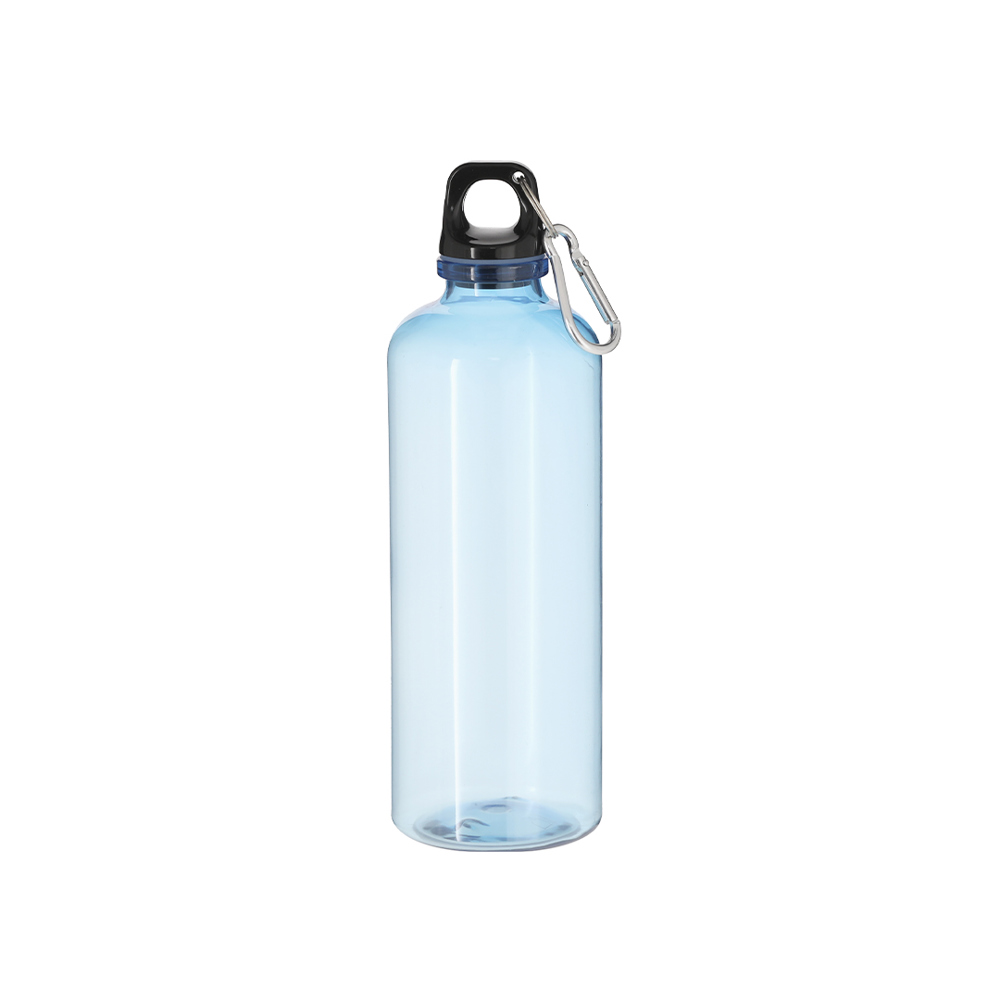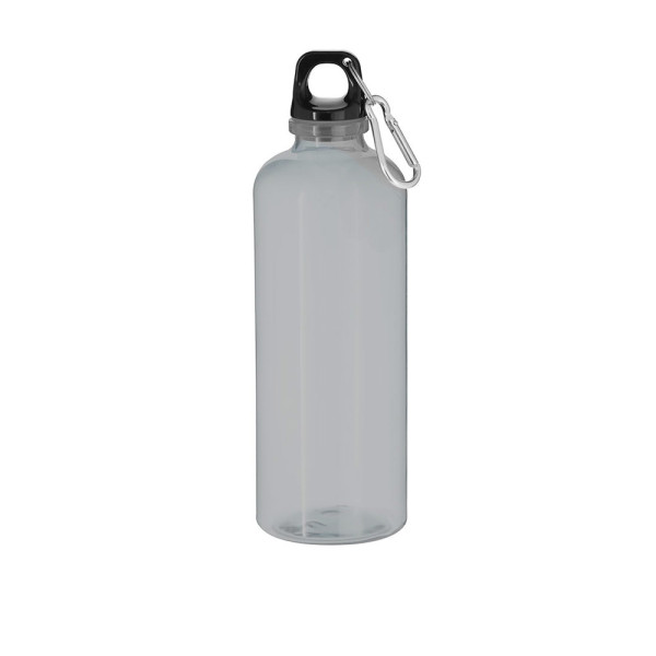 Bottle made of durable RPET material, with a capacity of 630 ml. Translucent body and black screw cap for optimal sealing. Includes a metal carabiner for easy transport. BPA free.RPET material is made from recycled plastic to promote the reuse of plastic waste and help the planet's sustainability.
