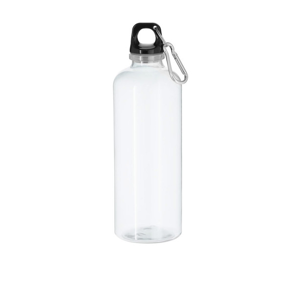 Bottle made of durable RPET material, with a capacity of 630 ml. Translucent body and black screw cap for optimal sealing. Includes a metal carabiner for easy transport. BPA free.RPET material is made from recycled plastic to promote the reuse of plastic waste and help the planet's sustainability.
