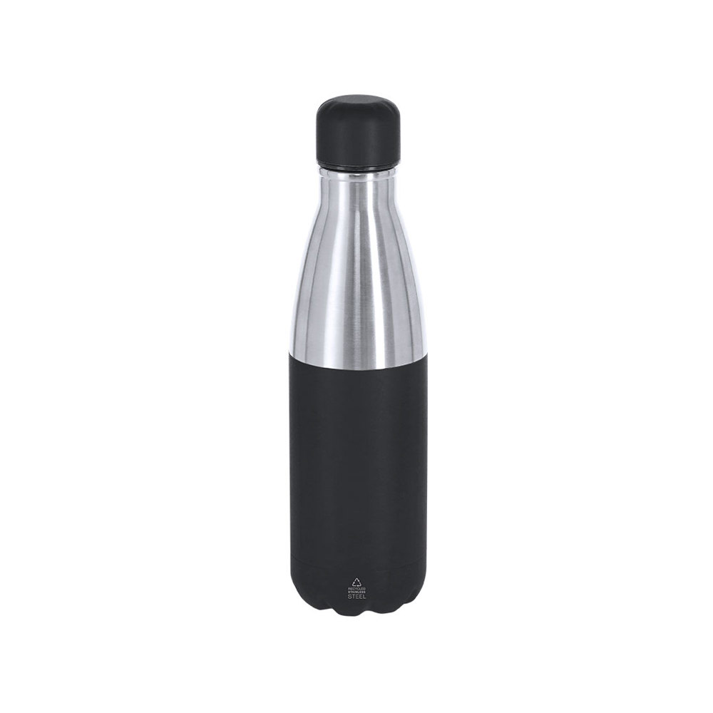 Thermal bottle with a capacity of 550 ml, made of recycled stainless steel with double walls. Its design combines a silver-finished body with a screw cap and matching matte base. BPA free. Includes recycled stainless steel label.Steel is among the most demanded materials and can be found almost everywhere, from everyday products to large constructions. With countless properties, including durability and high reusability, it is a highly valued alternative in sustainability solutions. When properly treated, it allows for obtaining new resources of infinite use.