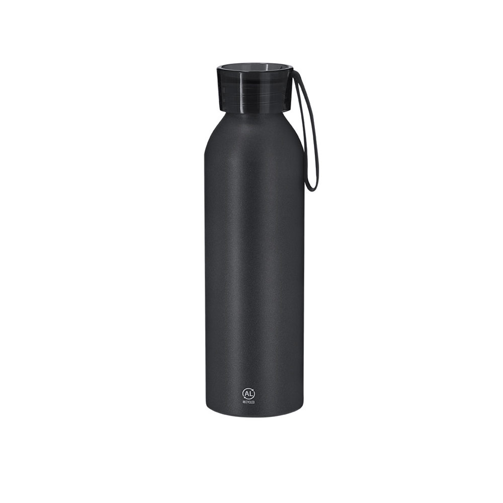 650 ml capacity bottle. Made of durable and sustainable recycled aluminum. With translucent screw cap and matching strap for easy transport. Frosted body finish. BPA-free. Includes Recycled Aluminum label.Recycled aluminum is a material with nearly infinite recycling possibilities, without losing its original properties and consuming less energy in this process.