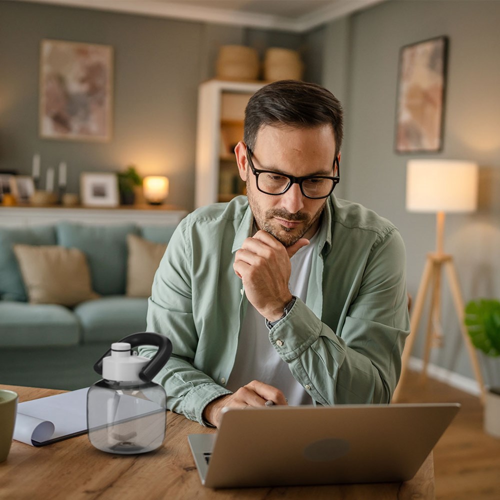 Resistant RPET bottle with 1.8 L capacity. With original kettlebell shape in translucent shine color. Includes screw cap for optimal sealing, straw, and sturdy transport handle. BPA-free.RPET material is made from recycled plastic to promote the reuse of plastic waste and help the sustainability of the planet.