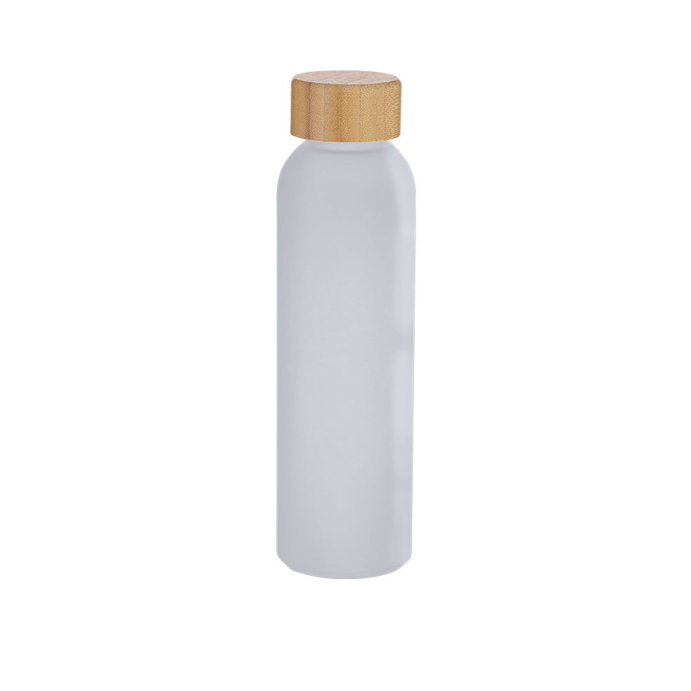 Recycled Glass bottle with a frosted finish, 500 ml capacity and bamboo cap. Includes Recycled Glass label.