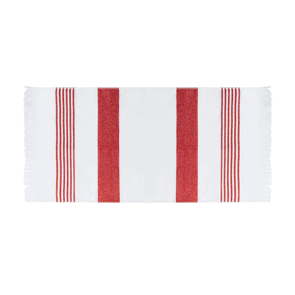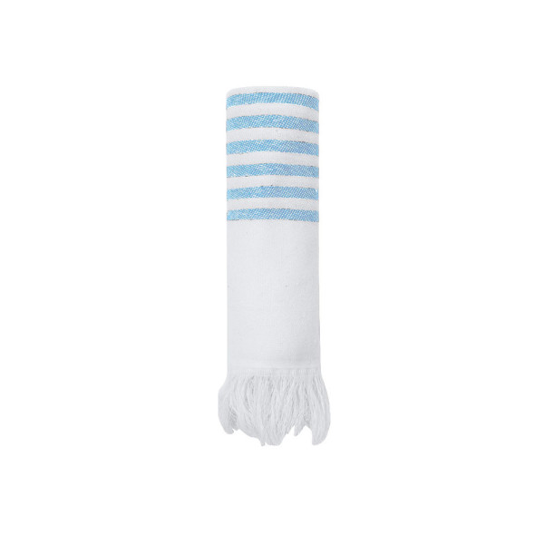 Soft pareo-towel of 3000 g/m², made from a combination of recycled cotton and recycled polyester SEAQUAL. Its design features a white base combined with colored stripes and distinguished fringes at the ends. Includes SEAQUAL design label, certifying its sustainable origin and contribution to ocean cleaning. SEAQUAL INITIATIVE works with collaborators and authorities to help clean our oceans. Marine waste from our beaches, ocean floors, and surfaces, rivers, and estuaries is collected through cleaning programs. It is then sorted into different types of materials, and the plastic portion is cleaned and transformed into RECYCLED MARINE PLASTIC, a fully traceable raw material that creates sustainable and inspiring products. By choosing products that contain RECYCLED MARINE PLASTIC, you are helping to clean our oceans. TOGETHER FOR A CLEAN OCEAN.