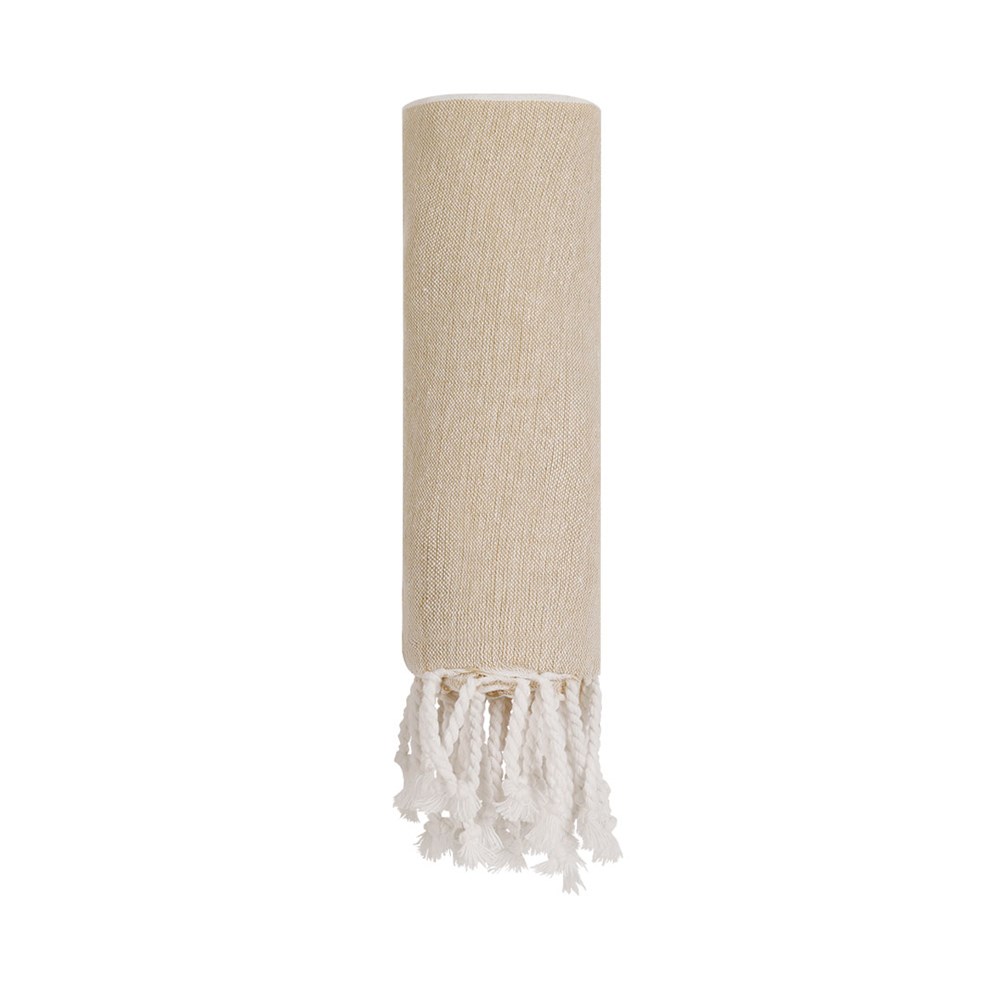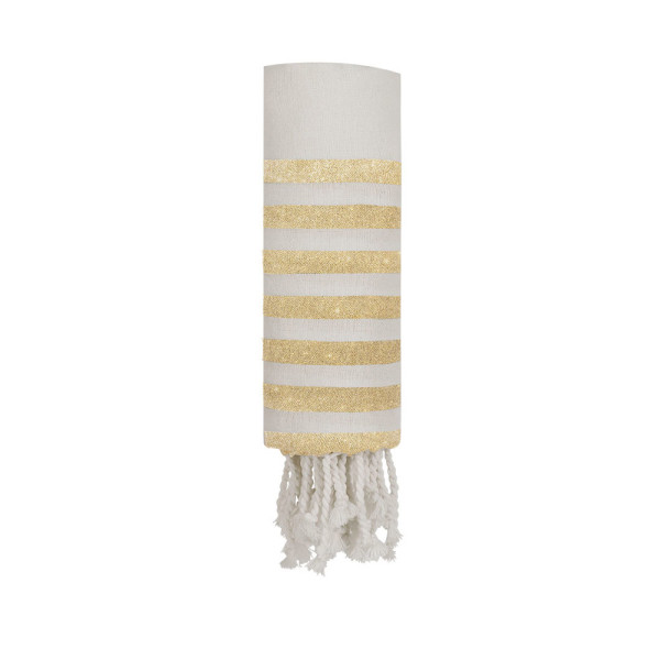 Towel Pareo made of recycled cotton of 180g/m2. White striped design combined with golden glitter stripes, solid beige ends, and distinguished cord fringes at the edges. Includes label with recycled cotton mark.