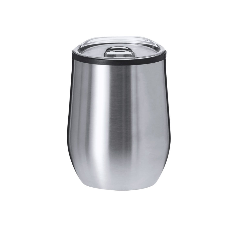 Thermal cup made of stainless steel with double wall and a capacity of 330 ml. With dispenser on transparent lid for easy opening, BPA-free. Ideal for keeping on your desk, table, or any surface to enjoy your favorite drink in peace.