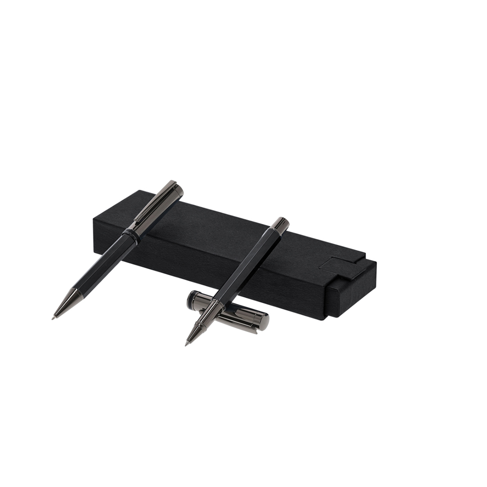 Exclusive ball pen and roller pen set of the highest quality from the Limited Edition collection. A modern, functional and gorgeous accessory that transcends all expectations. Distinguished by its elegant, minimalist design. Made in strong, durable stainless steel, in perfect combination with aluminium. Ball pen with sophisticated twist-open system and roller pen with a practical cap. Hexagonal grip design in matt metallic colours and a sober antrhacite glossy top. With metal clip, blue ink and refillable (roller pen with jumbo cartridge).From the perfect combination of exclusivity and design, come Limited Edition, a special collection of limited edition promotional ideas. A new concept, inspired by the fusion of premium products with the latest and most innovative trends and with a limited selection available, turn a gift into a unique and unforgettable experience.Exclusive Limited Edition presentation case, with a design protected by industrial property rights.Including card with description of Limited Edition in recycled cardboard.