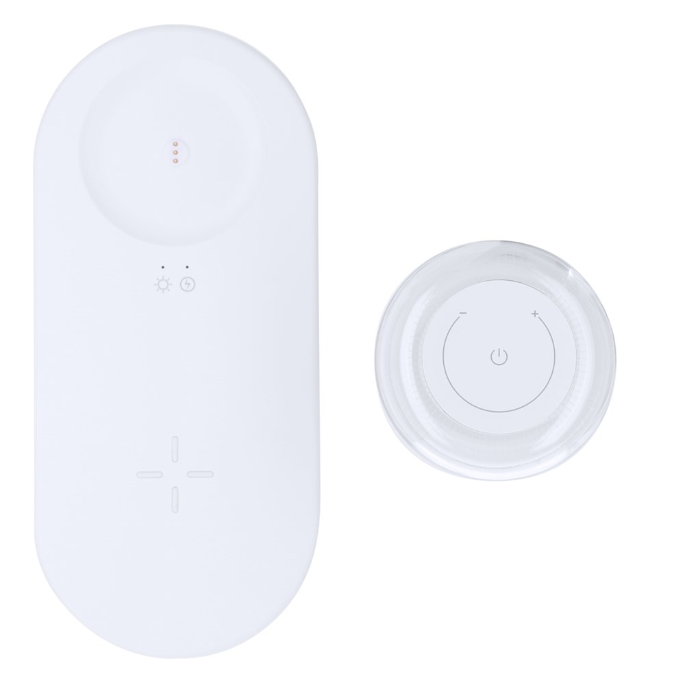Multifunctional lamp. It includes:-Portable wireless charging lamp with 12 LEDs. In addition, it has 2 light positions adjustable by touch buttons: one position in white light and another one in different colours.- 15W Wireless charger.