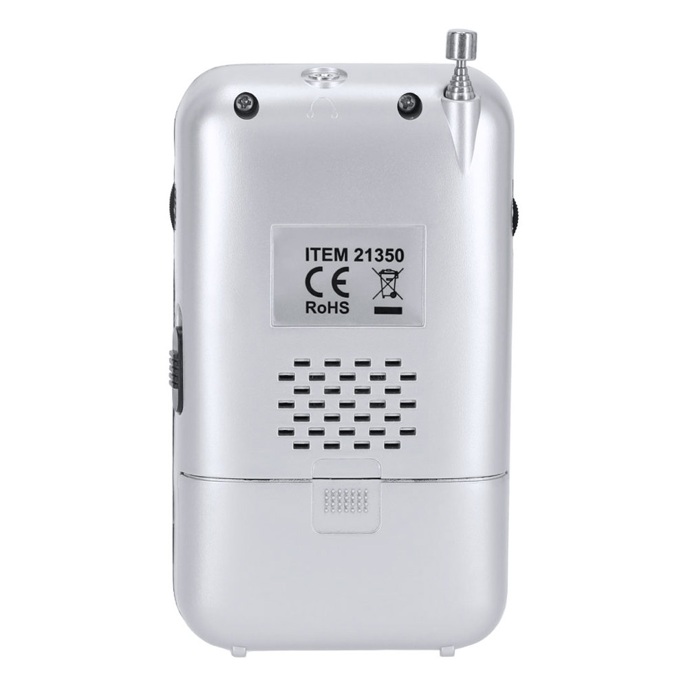 Vintage design radio with a 3W speaker for powerful sound. It offers AM/FM options with manual tuning, a volume control knob and an extendable antenna. Additionally, it includes a 3.5mm jack output for headphones. Powered by 2 AA batteries (not included).