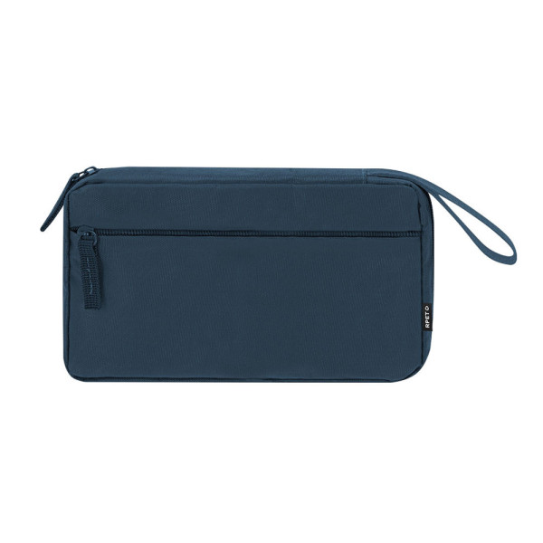 Organiser case made from 900D RPET. Full opening main pocket with double metal puller and multiple interior pockets ideal for storing cables: 3 pockets with elastic bands and 1 with a zipper closure. It also includes an exterior pocket with an invisible zipper closure and a handle for easy carrying. It includes an RPET label.RPET material is made from recycled plastic, thus promoting the reuse of plastic waste and helping the sustainability of the planet.