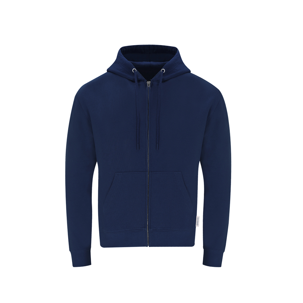 Unisex hooded sweatshirt with zip in Organic Cotton and Recycled Polyester, in soft 280 g/m2 quilted fleece. With double layer lined hood, adjustable round drawstrings - with matching stoppers - and metal eyelets. Elastane ribbed cuffs and waistband, and front kangaroo pocket. Hidden metal zip opening, with reinforced seam cover on collar. Including distinctive eco label.