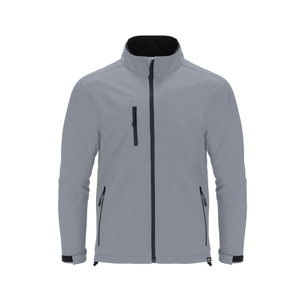 RPET Soft jacket made in 3 layers, 340 g/m2. With 8000mm membrane, waterproof and breathable. Exterior in Soft Shell and interior in microe polar fleece in black. With outside pocket on right chest and two side pockets with zips. With central zip and inverted zips on pockets, including black drawstring pullers. Raglan sleeves with velcro fastening system on the cuff in black. Matching chin protector and adjustable waistband, with elastic band and stopper. RPET label on the trim of the garment.