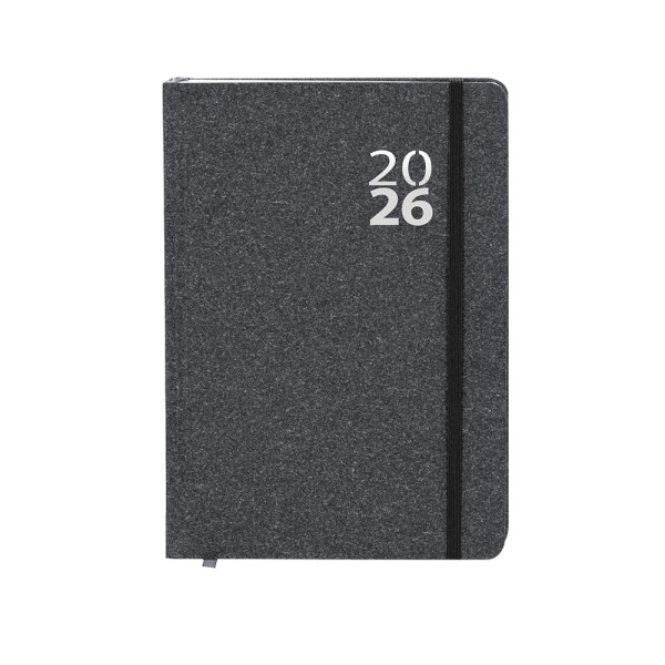 A5 size diary in Recycled Cardboard, with hard covers and matching elastic band closure. It includes a kraft presentation box and an ECO logo.Day page design, with an area for notes and fabric bookmark. In 2 languages: English and Spanish.The recycled cardboard comes from the reuse of manufacturing surpluses and paper recycling at the end of its lifespan, making it an environmentally friendly and sustainable canvas.
