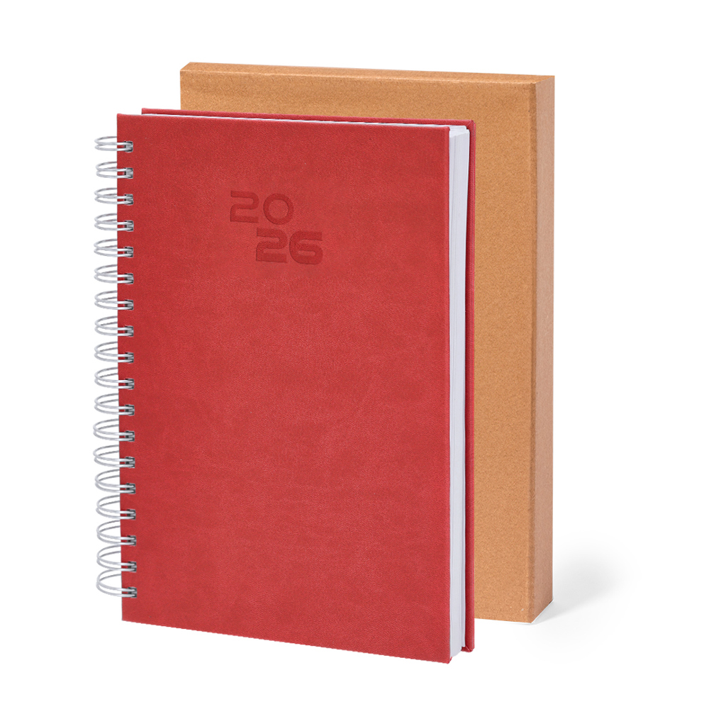 B5 size ring binder diary in soft and resistant PU leather, with hard covers. It includes a kraft presentation box.Day page design and pages with a die-cut corner. In 2 languages: Spanish and English.