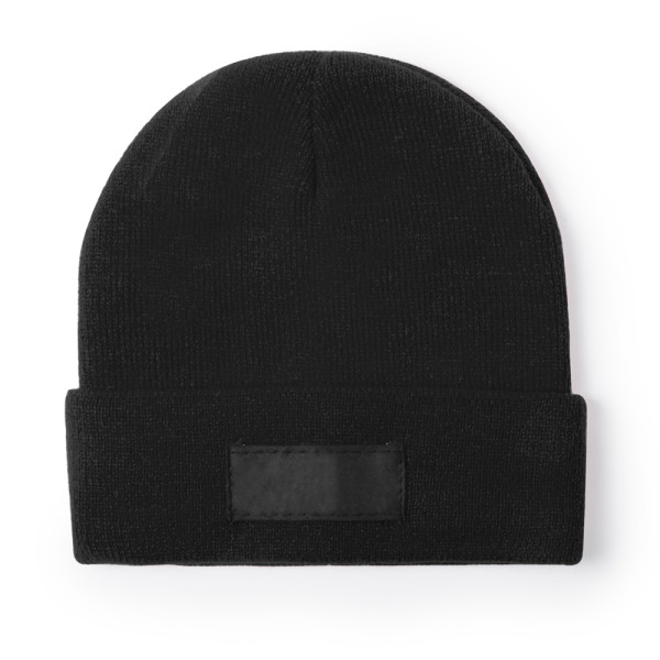 Soft and warm children's hat made of acrylic material. Elastic and easy fit, with matching hem and front label for branding.
