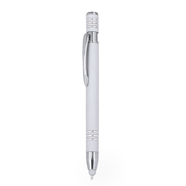 Push-button mechanism stylus ball pen, made of aluminium. Rubberised finish, specially designed for laser branding, revealing the logo in silver tone. Chrome plated fittings and matching clip included. Blue ink.