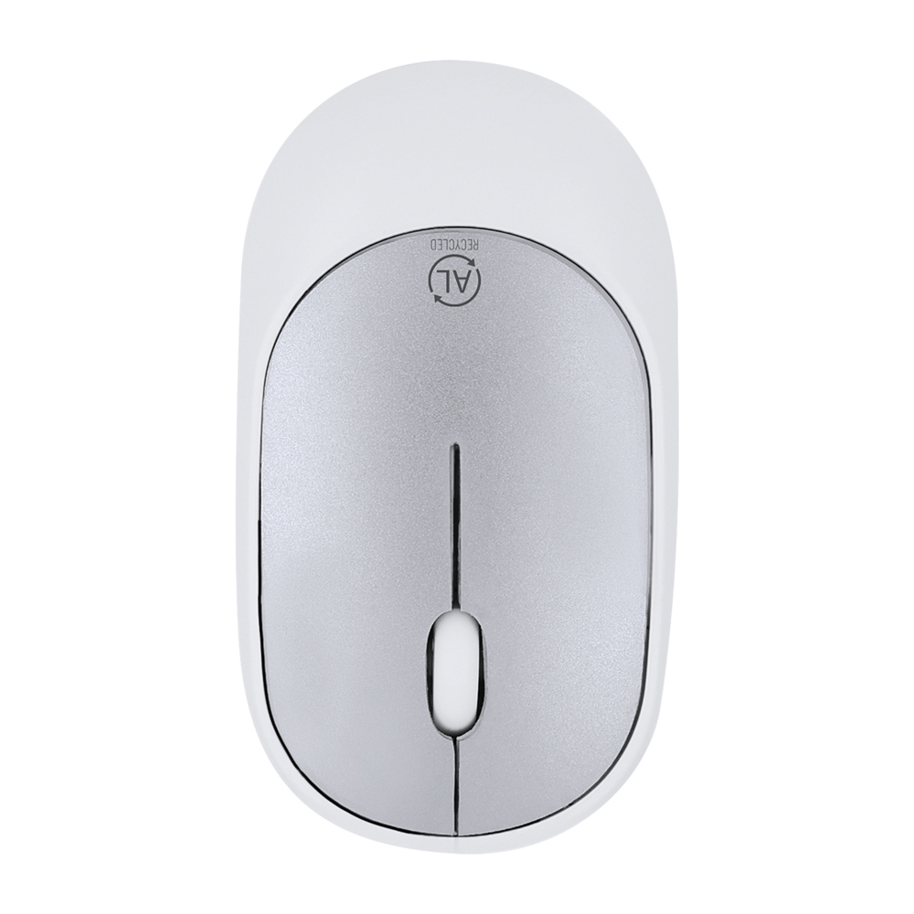 Wireless optical mouse made of durable RABS (recycled ABS), with recycled aluminium top plate. Ergonomic design and wireless connection (USB connector included). With recycled aluminium logo. Battery power supply (1xAA not included).RABS is a highly recyclable and highly resistant plastic with a multitude of applications that make of it an eco-friendly solution. With RCS certification, guaranteeing its recycled origin.Recycled aluminium is a material with almost infinite recycling possibilities, without losing its original properties and consuming less energy in the process.GRS (Global Recycled Standard) certification, guaranteeing the recycled origin of the material used to manufacture the product.