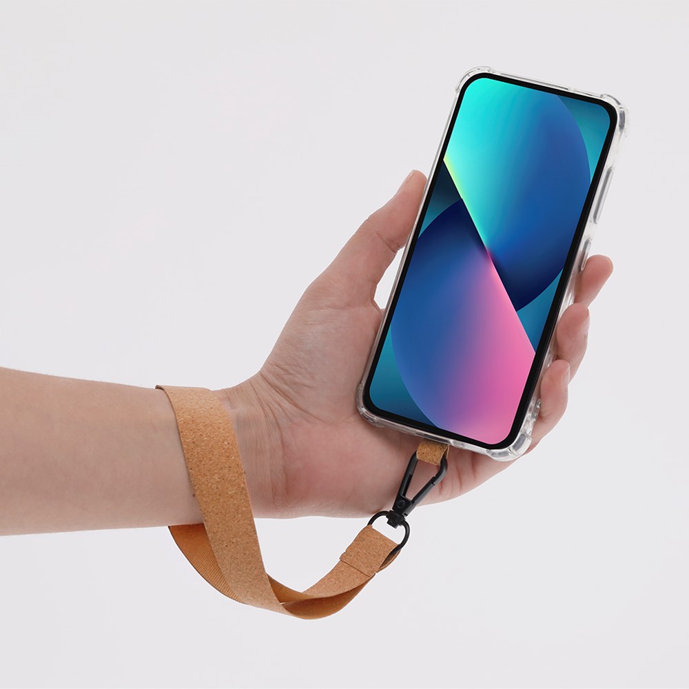 Smartphone bracelet holder made of cork. With matching carrying strap and black metal swivel snap hook. Made with plant-based elements to promote the use of natural raw materials and reduce pollutant emissions.