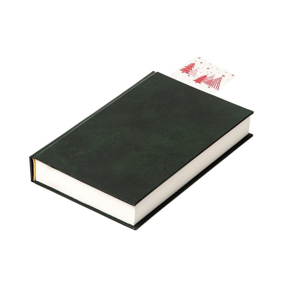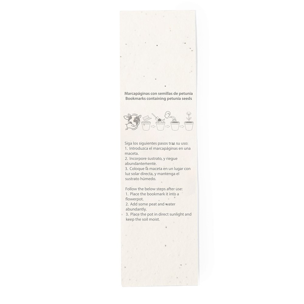 Christmas bookmark made of seeded paper with Christmas design. The paper includes petunia seeds, making it plantable paper at the end of its lifespan. With planting instructions on the back cover and large branding area.
