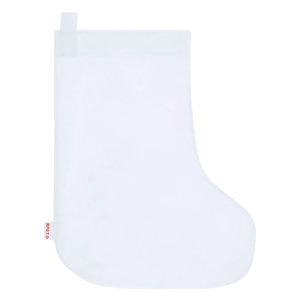 RPET non-woven sock in white, specially designed for crayon colouring. Front design with funny Christmas drawings, including 5 crayons in different colours. Supplied with a hanging ribbon, heat-sealed finish. RPET label outside.RPET material is made from recycled plastic, thus promoting the reuse of plastic waste and helping the sustainability of the planet.
