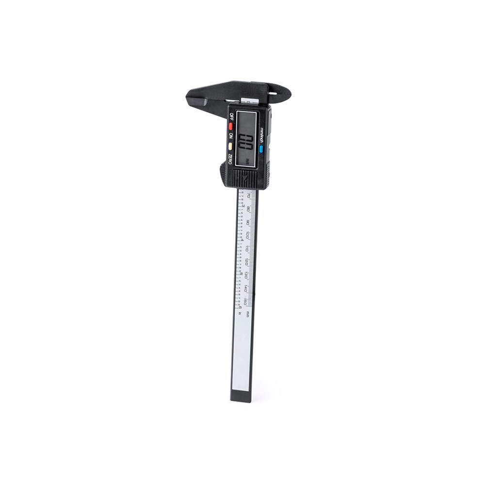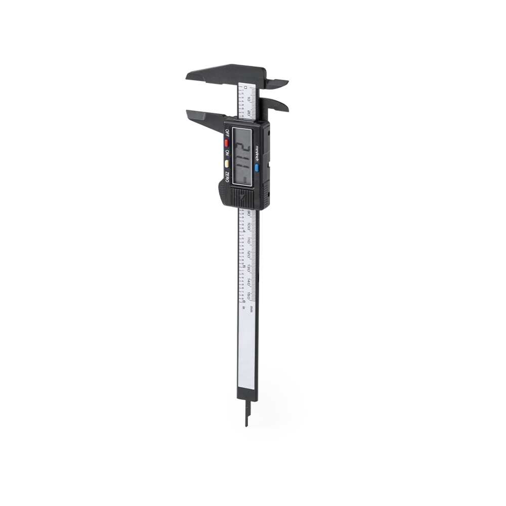 Caliper with digital and analogue measuring mode. With LCD display and ON/OFF buttons, ZERO for adjustment and another one to select the mm or inches. Includes probe for measuring depth and calipers for measuring the inside of objects. Measuring range up to 150 mm, with instructions in English and Spanish and presented in an individual kraft design box.