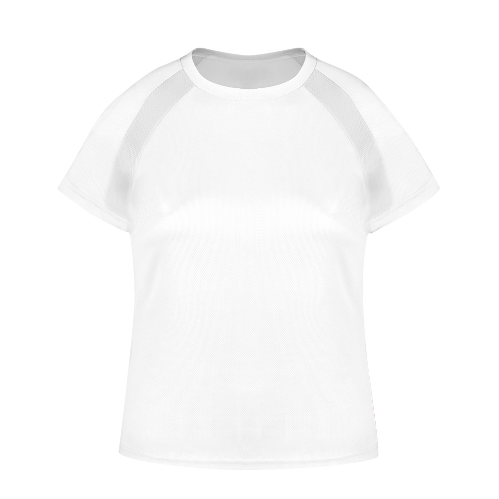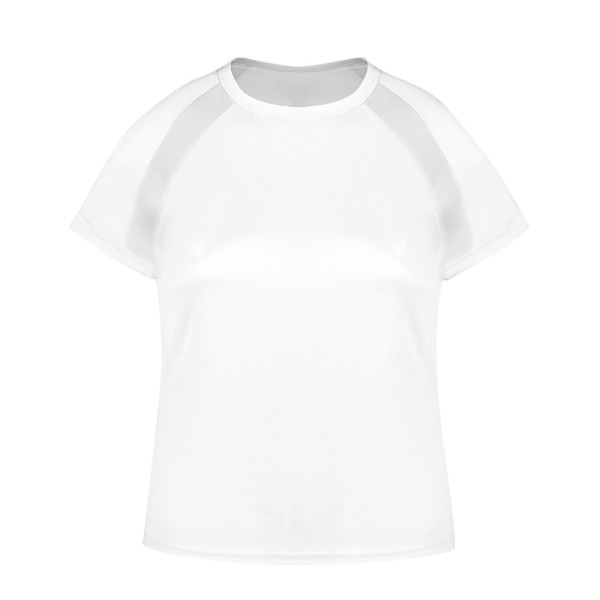 Woman technical T-shirt in 100% polyester breathable 135g/m2 material. With raglan sleeves, round neck and with front and side bands in breathable micro-perforated fabric. Available in sizes S, M, L, XL.
