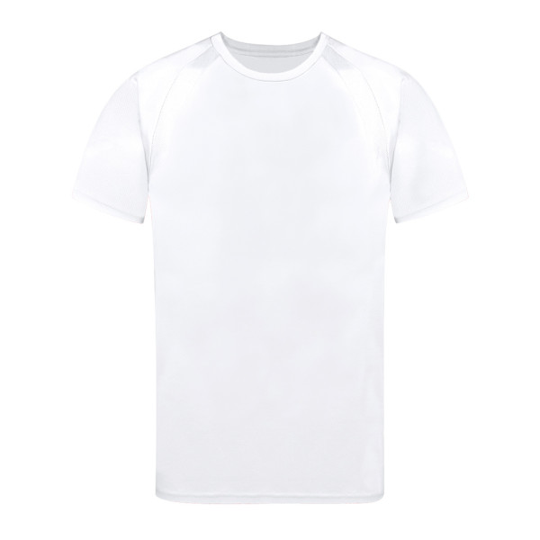 Adult technical T-shirt in 100% breathable polyester material 135g/m2. With raglan sleeves, round neck, and front-side bands in breathable, micro-perforated fabric. Available in sizes S, M, L, XL, XXL.