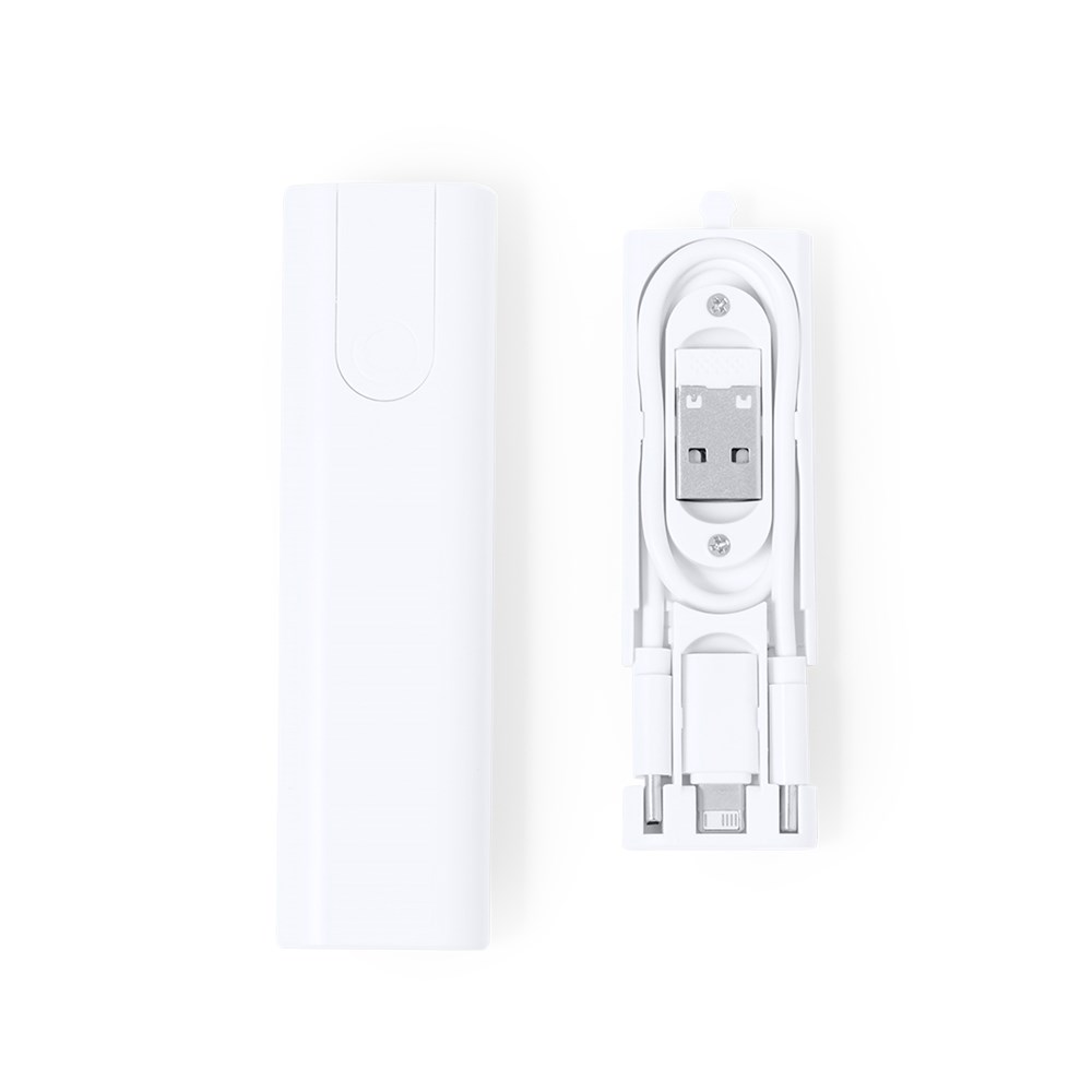 Complete set of charging cables. Packed inside a compact case made of resistant white ABS, with integrated smartphone holder. Includes charger and sync cable, suitable for data transfer and multiple connections: Micro USB, Type C and Lightning; SIM ejector included. 5V DC 3A. Presented in kraft design box.