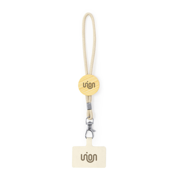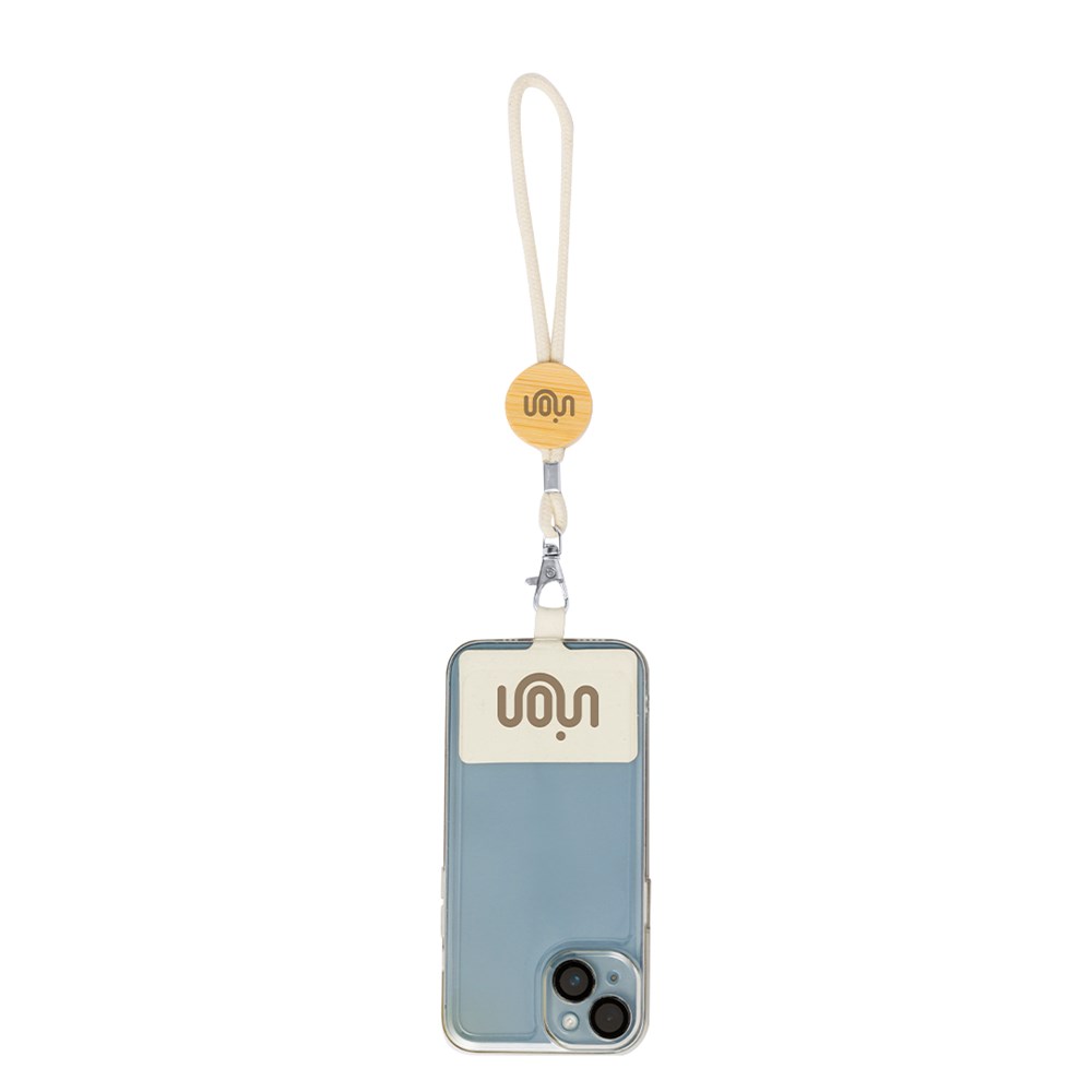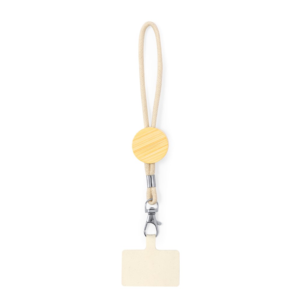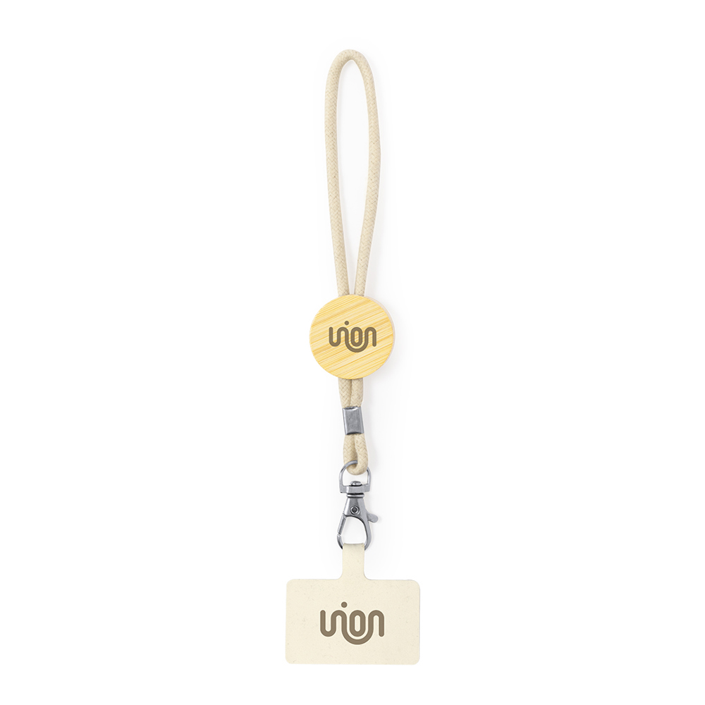 Original wristband in soft cotton, with mobile holder function and adaptable to all types of wrists. With carrying accessory to place between the case and the smartphone. Bamboo middle piece for customisation, especially designed for laser engraving. Presented individually in a recycled paper bag.Materials such as bamboo encourage the use of natural raw materials, reducing pollutant emissions. It comes from a highly resistant and versatile plant with rapid growth and regeneration, making of it an excellent alternative to traditional wood.
