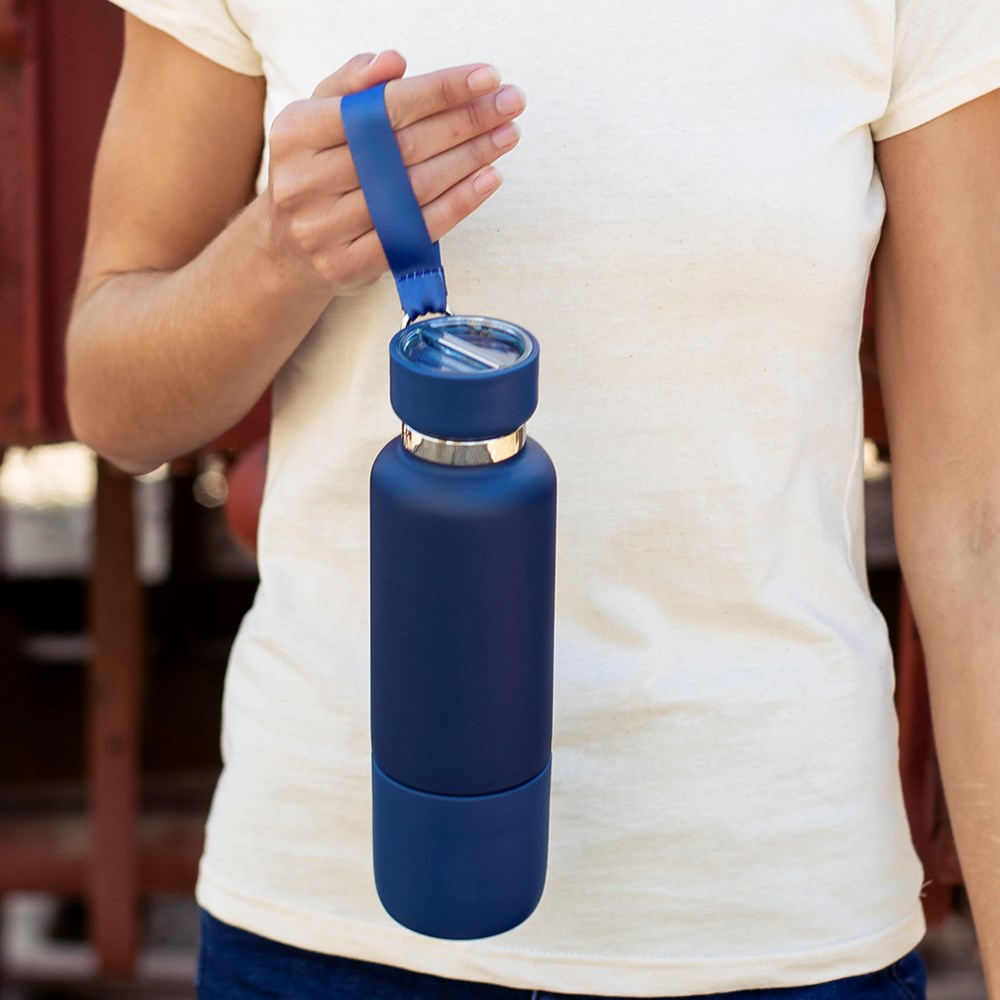 Unique stainless steel thermos flask with a capacity of 550 ml. Its screw cap ensures a perfect seal, featuring a compartment with two interchangeable cords: an elegant bracelet and a versatile lanyard with carabiner hook for easy carrying. The base holds a 300 ml screw fitting tumbler in matching colour, made of durable PP. Available in a variety of matt colours and presented in an individual kraft design box.