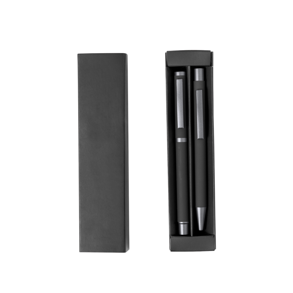 Stylish ball pen and roller pen set. Push-button ball pen and rollerball pen with cap, both with metal clip, jumbo cartridge and blue ink. Barrel in assorted solid colours, with rubberised finish and dark grey metallic accents. Presented in a matching color case, with a die-cut compartment for each piece.