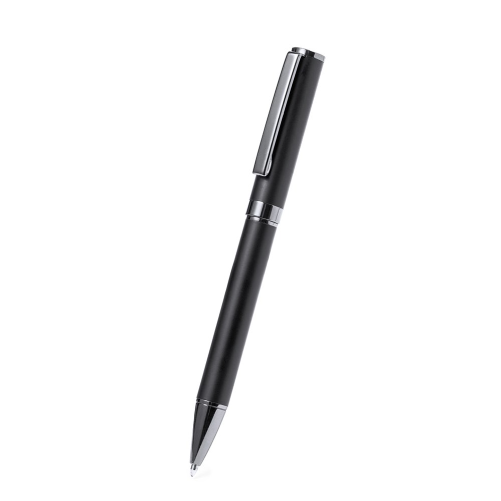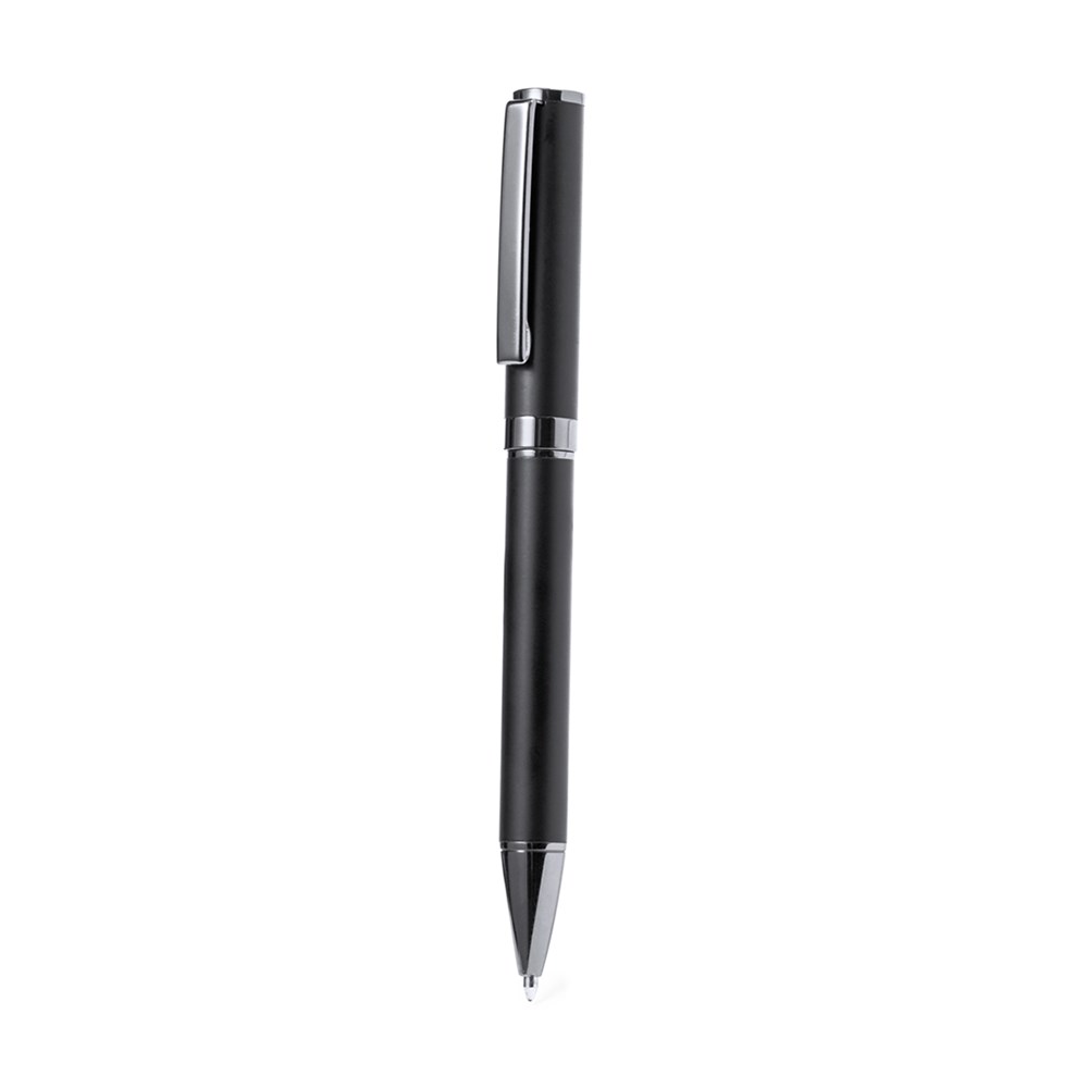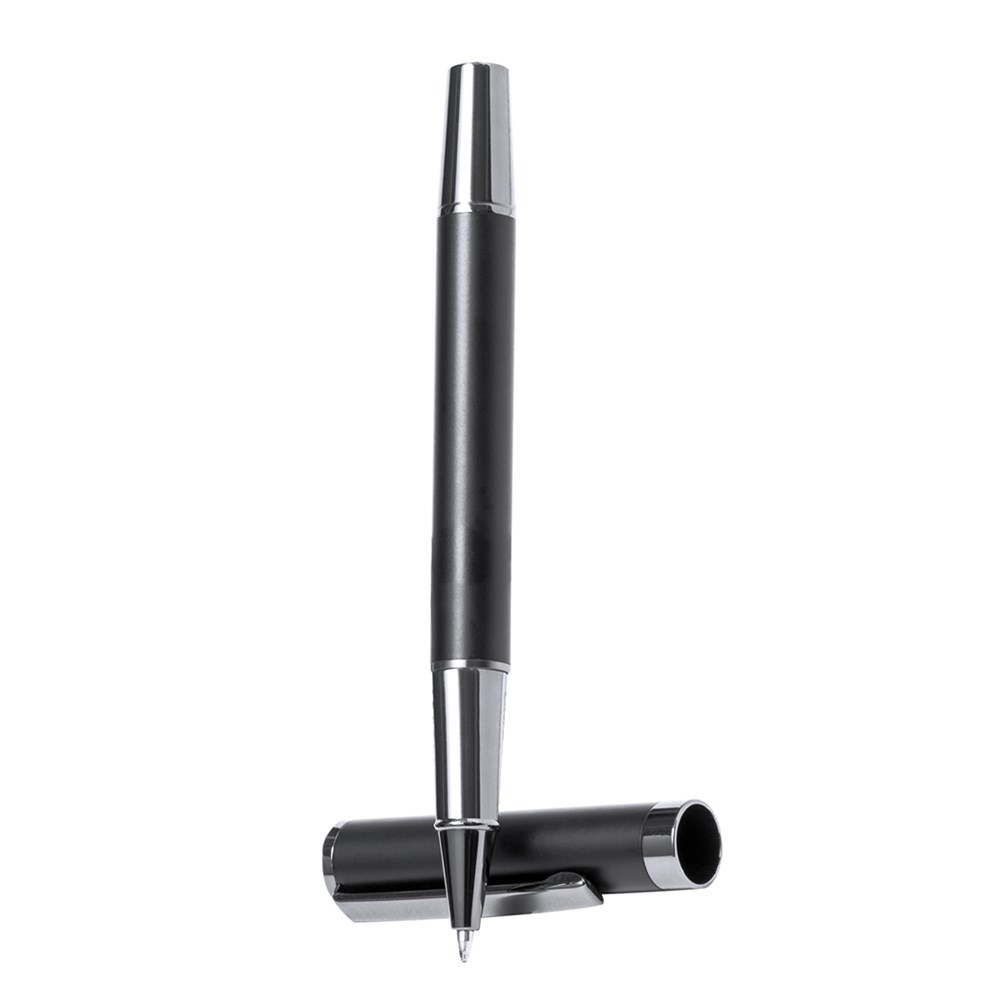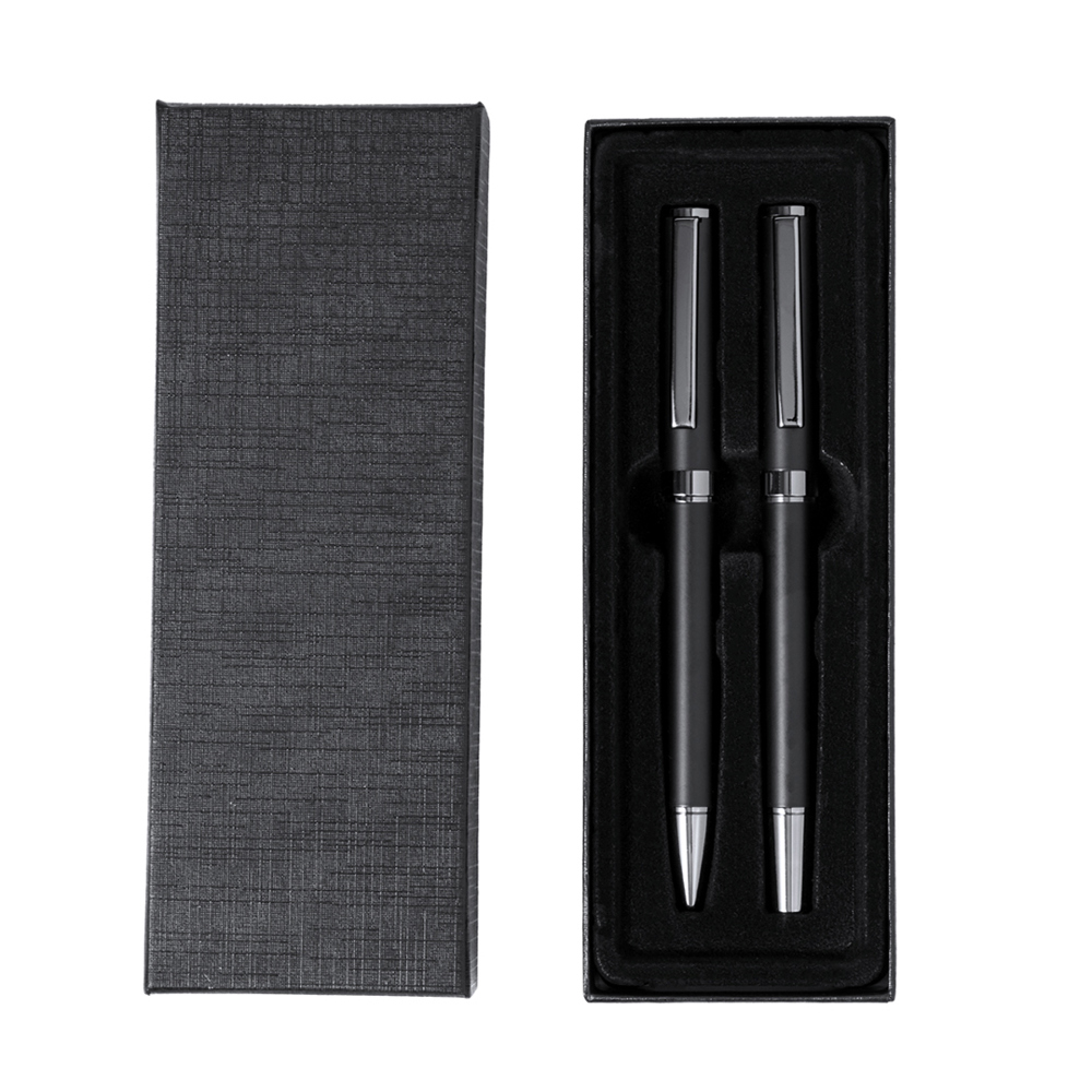 Stylish ball pen and roller pen set. Ball pen with twist mechanism and roller with cap, both with metal clip. Barrel in an elegant matte black finish and subtle chrome accents. in blue ink and presented in a black kraft case, with a velvet-touch die-cut interior.