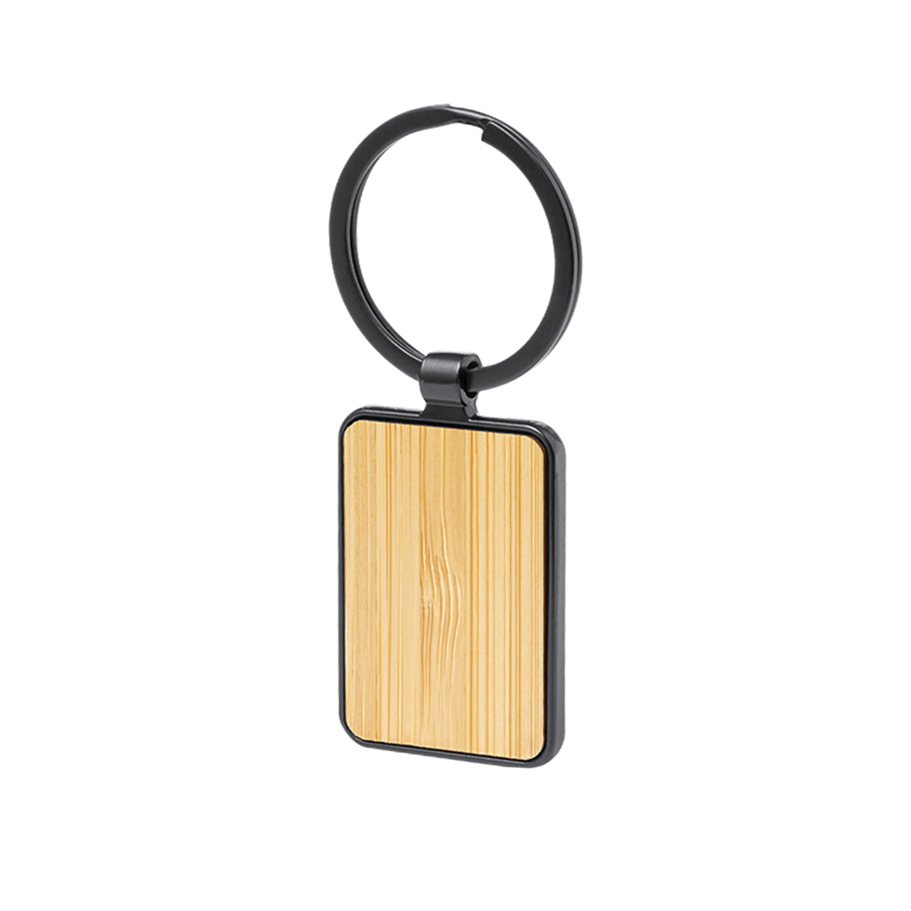 Elegantly designed keyring, made of black polished metal, with a soft bamboo side. Specially designed for laser engraving and available in rectangular and circular design. Individually presented in a Recycled paper bag.