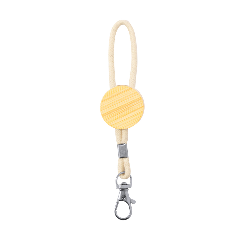 Eco keychain made in bamboo, with cotton string. Including a round piece for branding and a swivel metal hook. Presented in an individual Recycled paper bag. Materials such as bamboo encourage the use of natural raw materials, reducing pollutant emissions. In addition, bamboo comes from a highly resistant and versatile plant, with rapid growth and regeneration, making of it an excellent alternative to traditional wood.