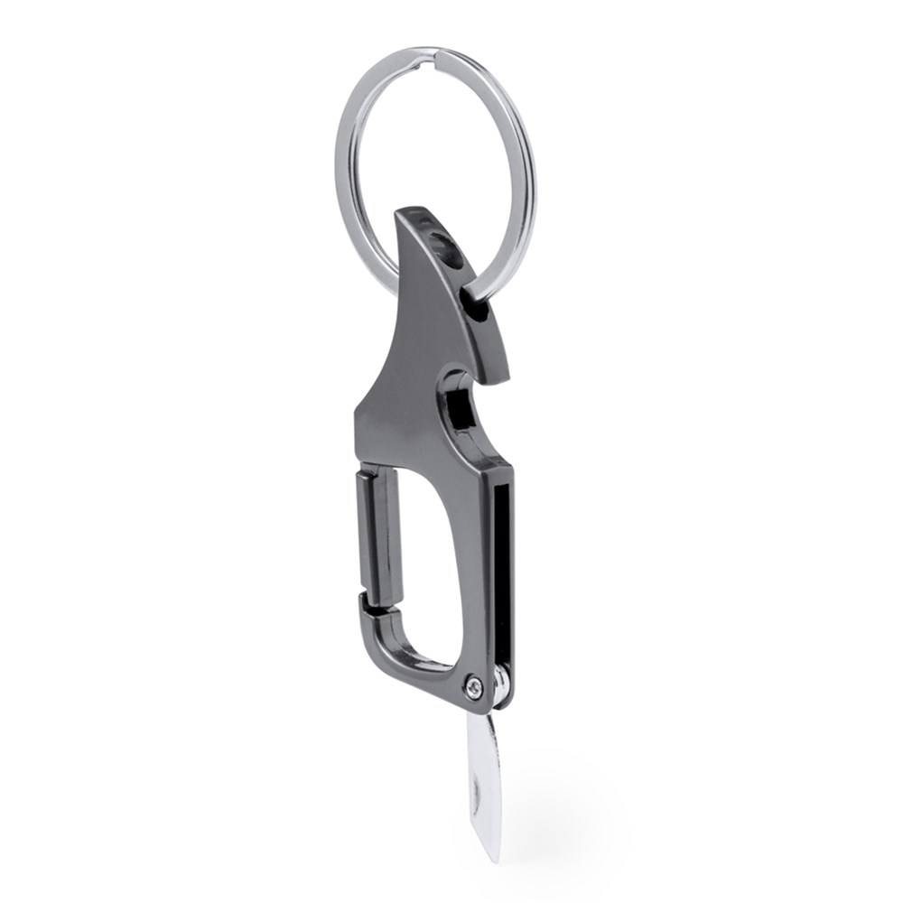 Useful metal opener with key ring and carabiner for quick attachment. With bottle opener on one end and with a small stainless steel knife on the opposite end, ideal for opening letters, packages... In an elegant metallic black colour and presented in a Recycled paper bag.
