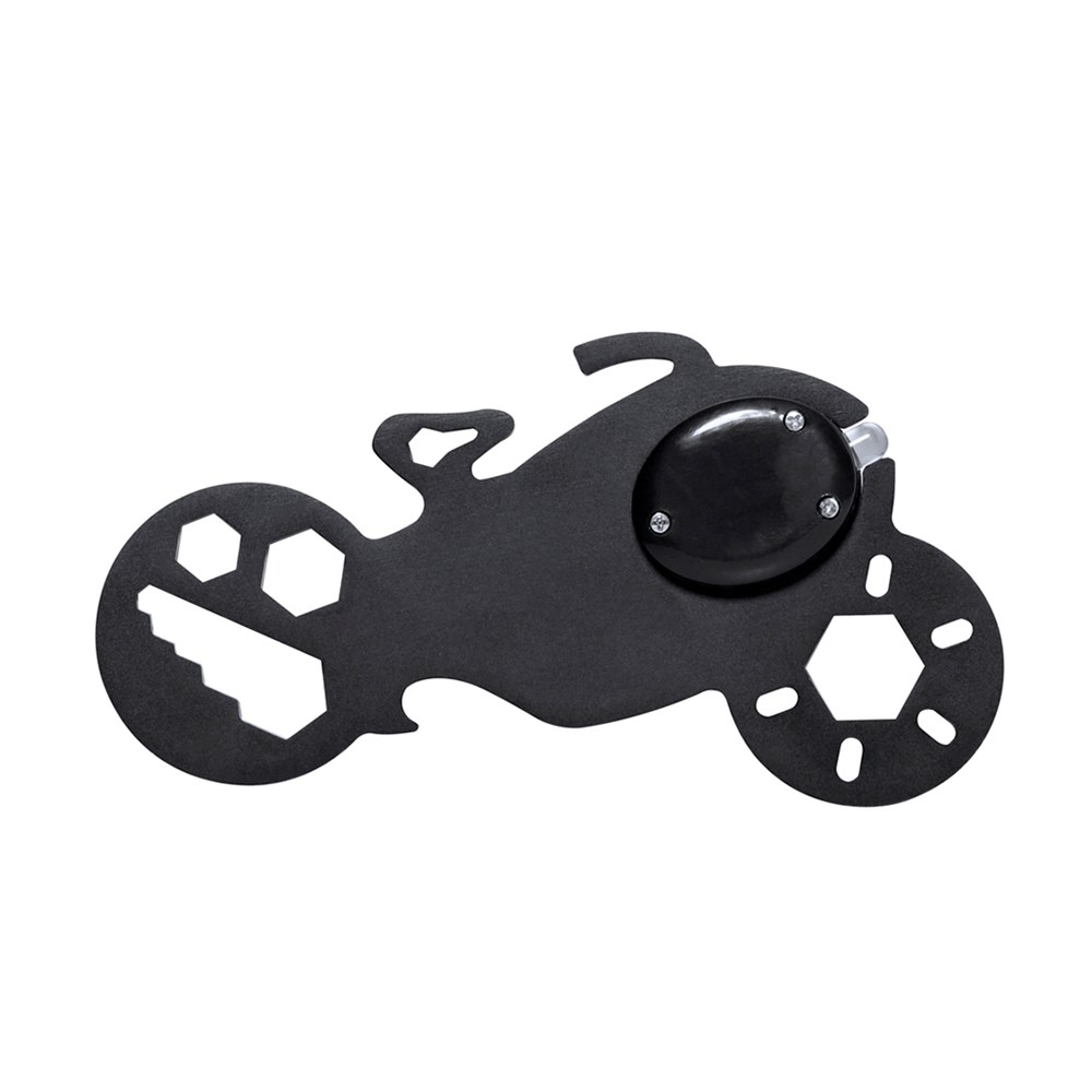 Cool and convenient stainless steel multi-tool in the shape of a motorbike. With 11 functions, among others: hexagon spanner in various sizes and bottle opener. Supplied with 1 LED torch powered by a button cell battery. Presented in a Recycled paper bag.