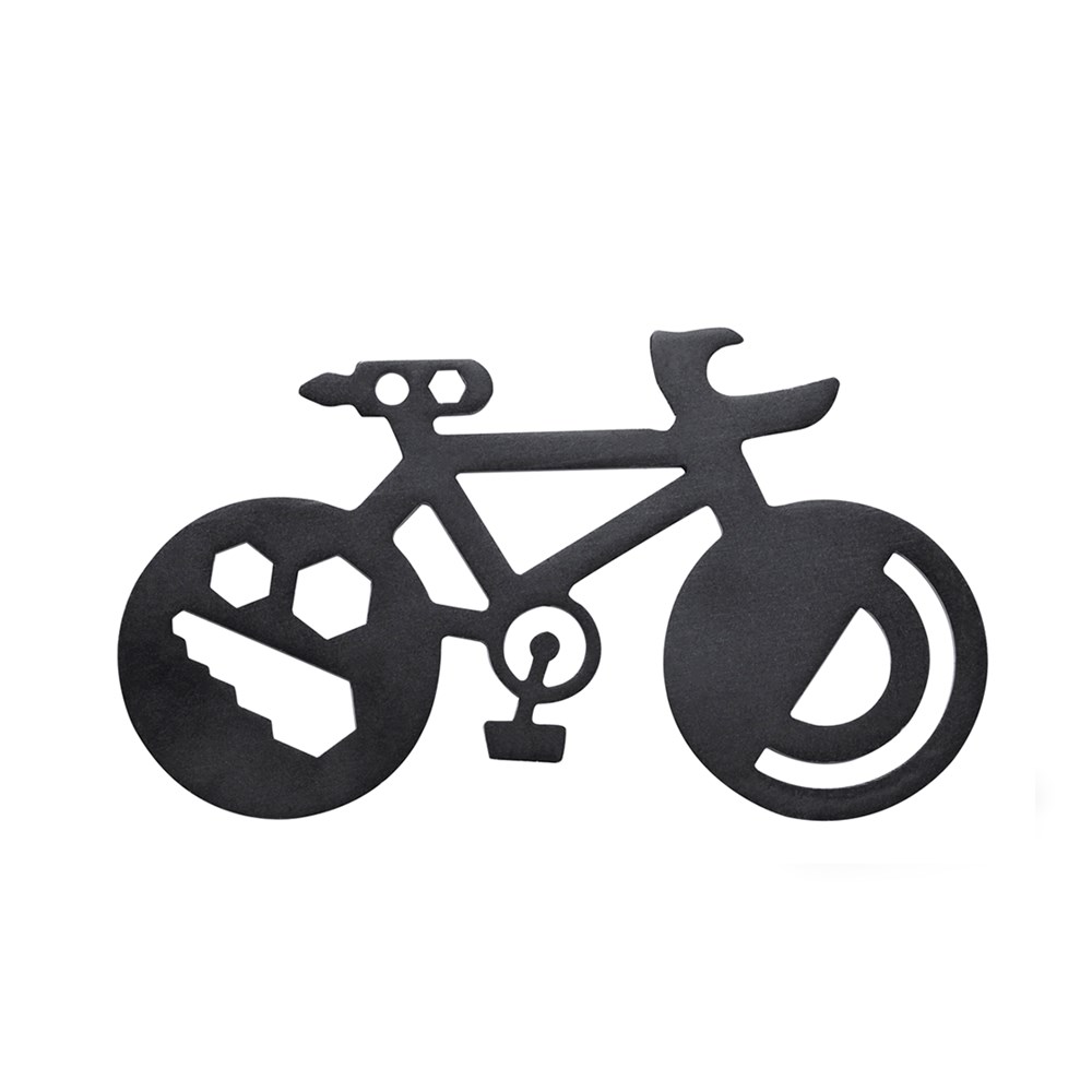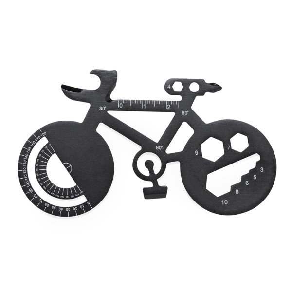 Handy and useful multi-tool in stainless steel, bicycle shaped. With 16 functions, among others: flat and philips screwdriver, spanner for hexagon nuts in different sizes, ruler, angle protractor and bottle opener. Presented in a Recycled paper bag.