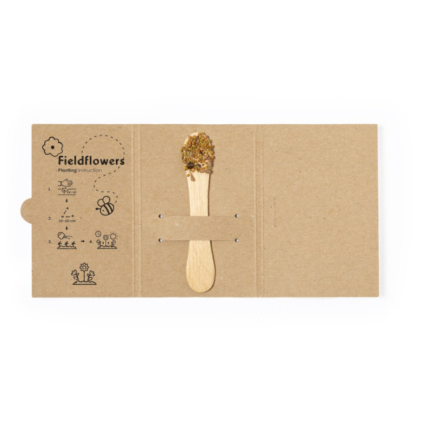 Stick with seeds. One end has a large brandingking area and the other end includes wildflower seeds ready to be planted. Presented in a recycled cardboard card with planting instructions.