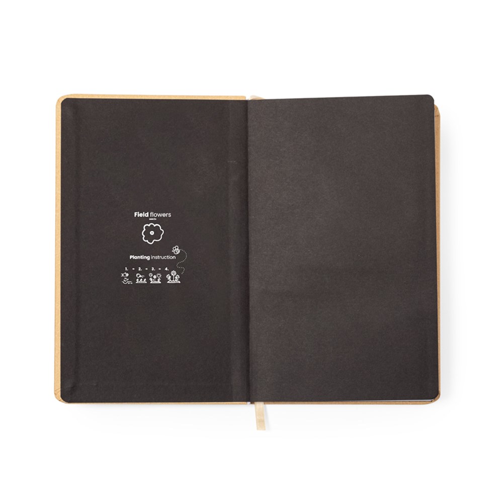 Seed notebook made of resistant recycled cardboard. With hard covers, bookmark and 80 single-striped inside sheets in recycled paper. In addition, the front cover contains a capsule of wildflower seeds, in assorted colours and with planting instructions on the back cover.Recycled cardboard comes from the reuse of manufacturing surpluses and paper recycling at the end of its lifespan, making it an ecological and sustainable canvas.