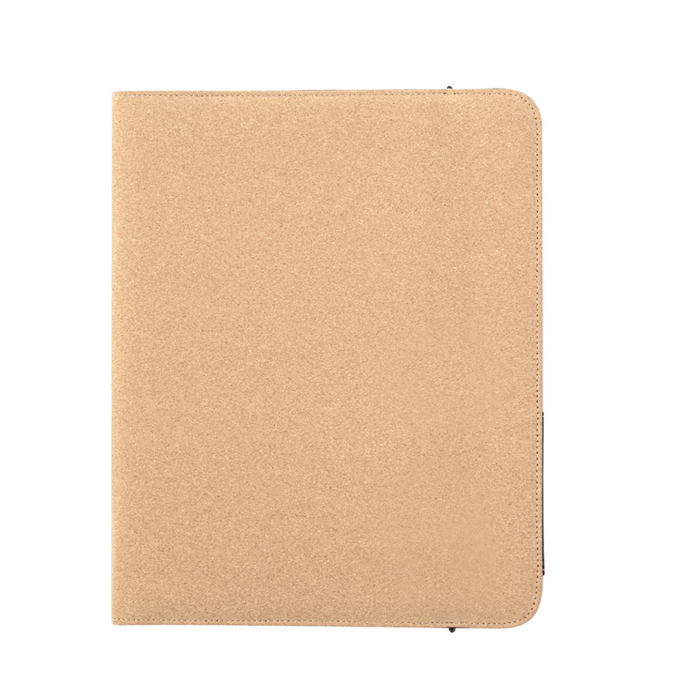 Elegant folder made in natural cork. With a large inner pocket for sheets of paper, 4 card holders, elastic pen holder and a notepad of 20 sheets with single-striped layout. Elastic band closure outside and packed in an individual Recycled bag.Made with plant-based elements to promote the use of natural raw materials and reduce polluting emissions.