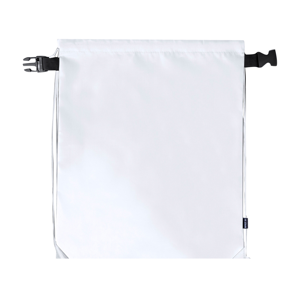 Drawstring backpack in soft RPET 210T polyester. With safety buckle closure and self-closing strings. Reinforced corners, metal eyelets and outside label with RPET logo. Available in a wide range of colours (white colour specially made for sublimation printing).RPET material is made from recycled plastic, thus promoting the reuse of plastic waste and helping the sustainability of the planet.