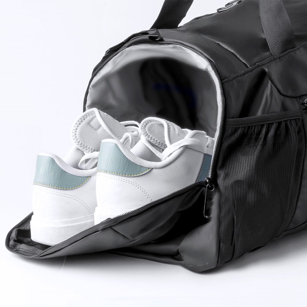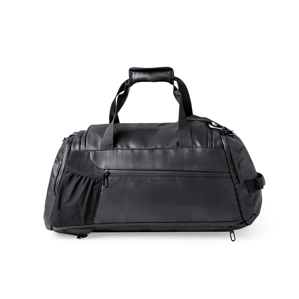 Backpack/bag made of resistant and soft PU leather. Its central compartment is closed with a double zip puller. It also has an independent side pocket and an additional one at the other side, both with zip closure. At the base there is a pocket specially designed for shoes. It also includes an outer mesh pocket. It offers three carrying options: as a backpack, with padded, folding handles; as a handbag; or as a shoulder bag, with an adjustable shoulder strap. The zips are discreetly concealed for a smart design. Presented in an individual bag.