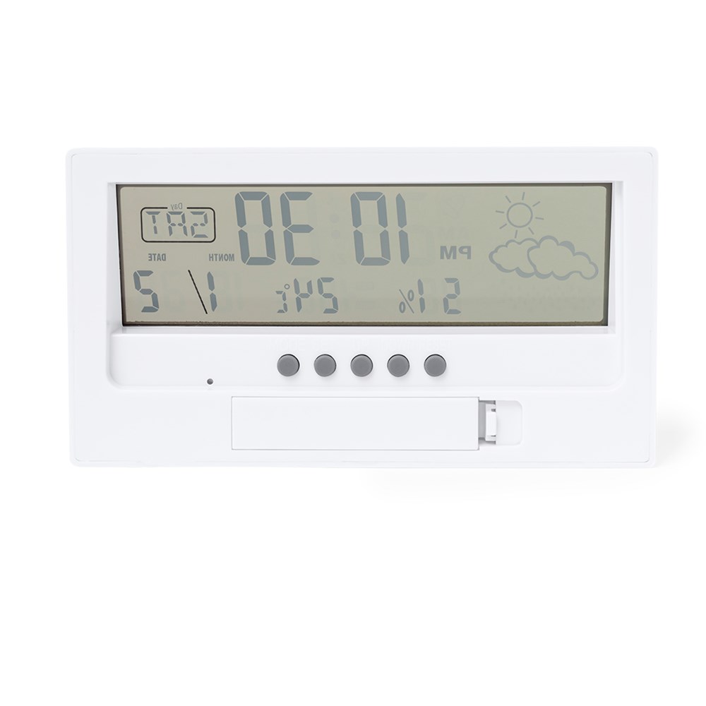 Weather station with bamboo face. With temperature and humidity sensor, calendar, and alarm function. Battery powered (1xAAA not included) and presented in an attractive kraft design box. Instruction manual available in English and Spanish.Materials such as bamboo encourage the use of natural raw materials, reducing pollutant emissions. It comes from a highly resistant and versatile plant with rapid growth and regeneration, making of it an excellent alternative to traditional wood.